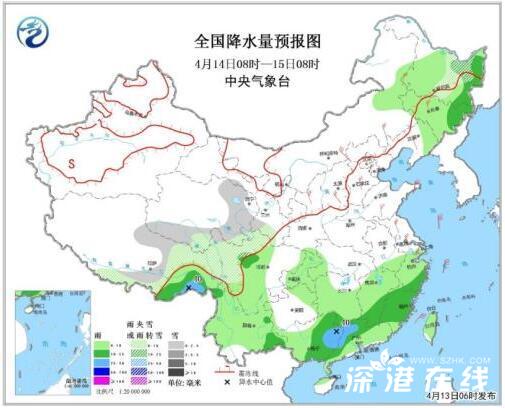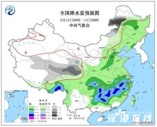 全国降水量预报图(4月13日08时-14日08时) 4月14日08时至15日08时,黑龙江中部、青藏高原中东部等地的部分地区有小雪或雨夹雪;东北地区东部、江南东南部、华南中东部、西藏东南部等地的部分地区有中到大雨,上述部分地区还将伴有雷暴大风或短时强降水等强对流天气。内蒙古、华北、黄淮东部、江淮东部等地有4~6级风。东部海区大部将有6~7级、阵风8级的大风。