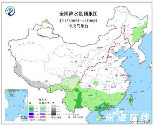 全国降水量预报图(4月14日08时-15日08时) 4月15日08时至16日08时,川西高原北部、青藏高原南部等地有小雪或雨夹雪;西南地区大部、江南南部、华南及东北地区东部等地小到中雨,其中,广西东部和广东西部等地局部有大雨(25~40毫米),上述局部地区还将伴有雷暴大风或短时强降水等强对流天气。内蒙古中东部、东北地区、江淮东部等地有4~6级风。