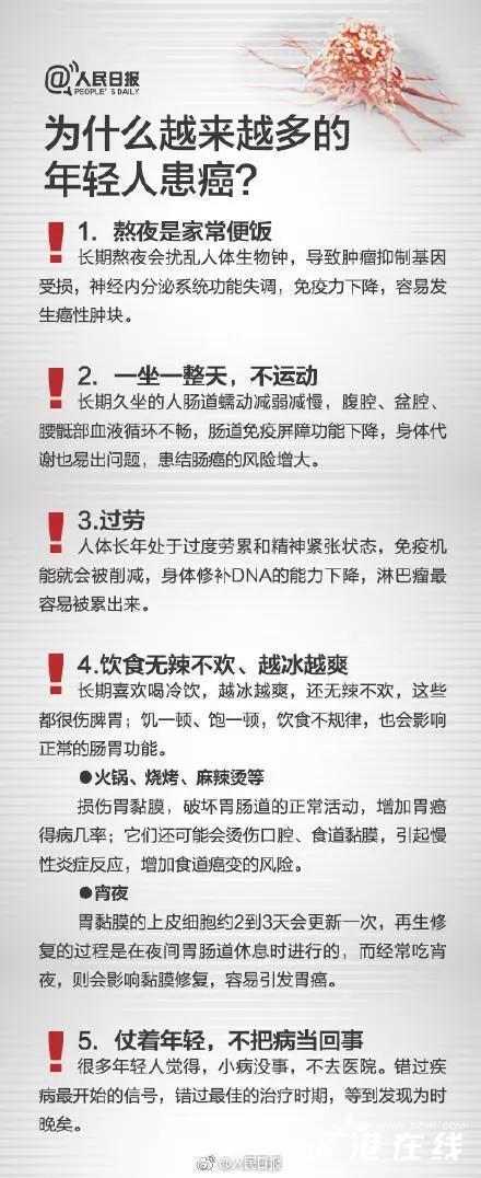 经过统计发现,总体来说,0~30岁组恶性肿瘤发病率均较低,30岁以上人群发病率快速增高,80~岁组时达到高峰,之后有所下降。 @人民日报微博曾归纳了年轻人患癌的原因: