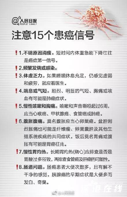 据北京晨报,谈及我国肿瘤五年生存率不足发达国家一半的原因。长期从事肿瘤病因即癌变机理研究的程书钧院士表示,造成这样的原因是多方面的。其中最重要的原因是我国相当一部分肿瘤患者处于中晚期,到医院治疗时,肿瘤已经发生转移,很难治愈了。 另外,癌症发病率在我国缓慢增长的趋势,一方面与我国人群整体寿命的增长和老龄化社会的到来有关,另外一方面,社会大环境和家庭小环境的污染,促使一部分肿瘤发生率增高;此外,人们生活方式、饮食习惯等改变,比如长期摄入过度高脂肪食物会导致结肠癌肿瘤发生的可能性增高。 为此,他提醒公众,预防癌症核心的问题之一是改善生活方式,培养健康的饮食及生活习惯。 据@人民日报微博,当你的身体出现以下信号时候,就得小心了: